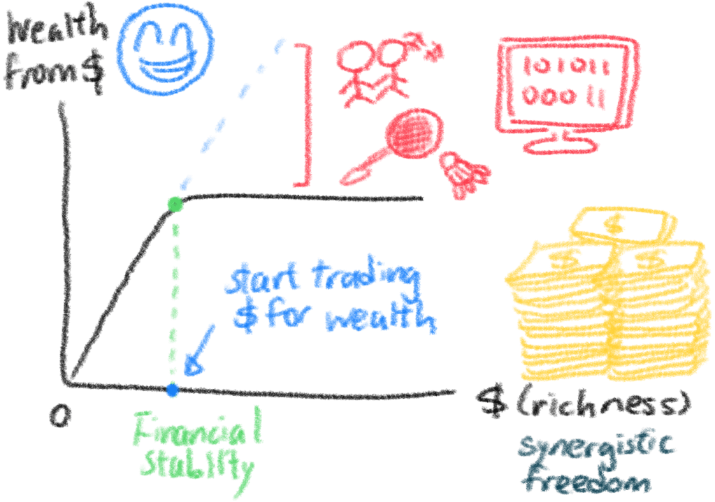 You must first make enough money that can let you survive, and free yourself from the things that you don’t like doing (aka a job that you hate). At this phase, more rich translates to more wealth, because money is the limiting factor.